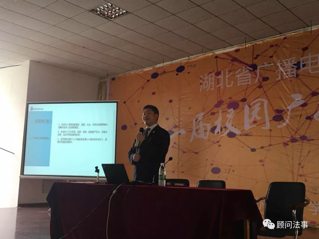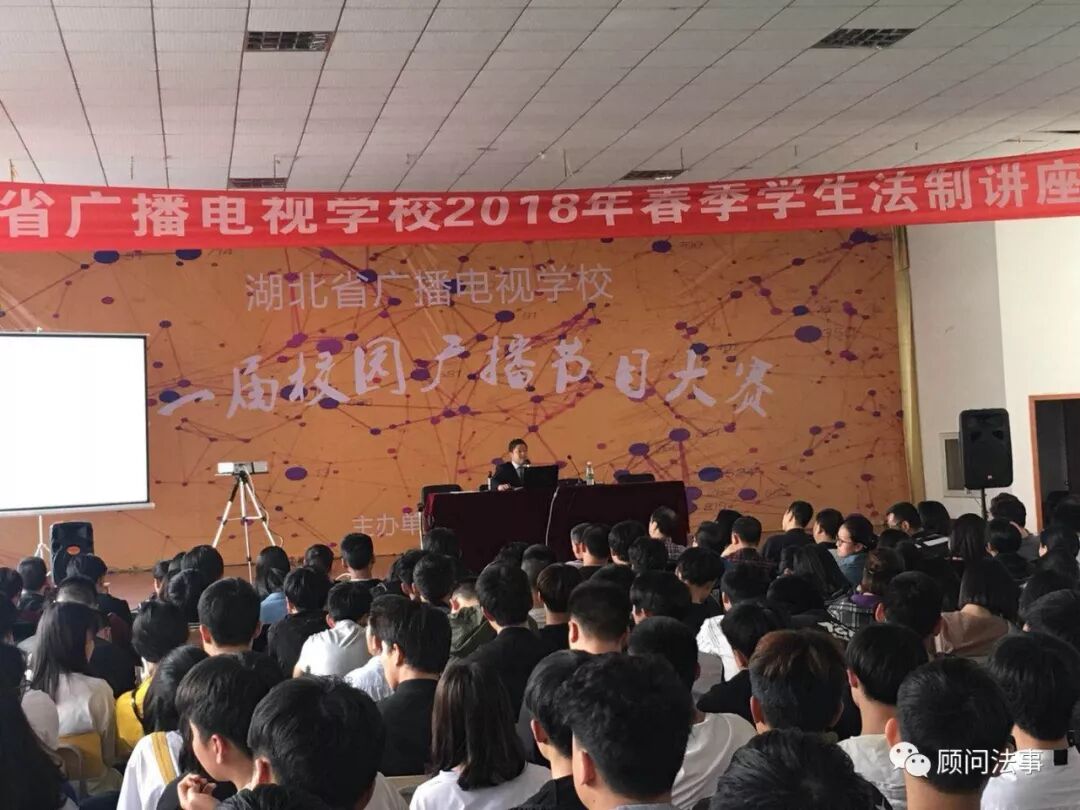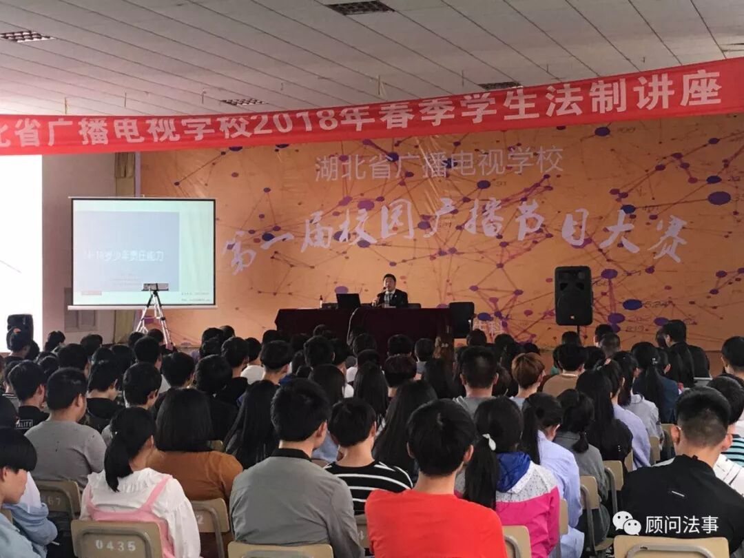 2018年4月11日,北京盈科(武汉)律师事务所罗德江律师,赴湖北广播电视学校开展法制专题宣讲,围绕“14-18周岁少年责任能力”这一主题,分析青少年应当承担的民事责任和刑事责任,并结合自身经历,勉励青少年成才先成人,胸怀理想,努力奋斗。据悉,讲座由刘校长主持,在校的600多名师生全部参加。
